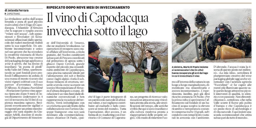 La rivelazione arriva dall'acqua limpida e pura di quel piccolo mare calmo che è il lago di Capodacqua, l'Atlantide d'Abruzzo che fa sognare o meglio ancora "volare sott'acqua", sub appassionati e filmmaker (di fantascienza) affascinati dallo spettacolo dei ruderi medievali visibili sotto la sua superficie. Un ambiente incontaminato e unico nel suo genere che ha stimolato la creatività visionaria di Mario Di Paolo, abruzzese top creator del packaging design applicato a wine & spirits, che ha deciso di insediarsi "in punta di piedi" nella Valle del Tirino, sperimentando su quei fondali poco profondi l'affinamento in anfora di una massa di mosto ricavato dai vicini vigneti coltivati con il suo partner d'avventura Alfonso D'Alfonso. Si chiama Fuoridimè - Rivelazione il primo vino appena ripescato dopo 9 mesi di invecchiamento underwater in 4 orci di terracotta da 55 litri di capienza massima ognuno. Recipienti ermeticamente sigillati e recuperati per un primo monitoraggio che sarà seguito da Giuseppe Arfelli, docente di enologia al Dipartimento di bioscienze dell'Università di Teramo, che ne studierà l'evoluzione. Le operazioni di recupero sono state affidate all'intervento, a titolo gratuito, del Nucleo carabinieri subacquei di Pescara coordinati dal primatista di apnea sotto i ghiacci Dante Cetrioli, grande esperto del piccolo ma straordinario ambiente di Capodacqua, «una piscina naturale ideale per l'allenamento dei sub e fredda come i laghi alpini» rivela il sub. Rosso violaceo di struttura, versatile a tavola come sa essere un iconico Montepulciano d'Abruzzo d'altura diraspato a mano, Rivelazione è un vino fuori dalle dinamiche convenzionali e ben rappresenta la vocazione del territorio. Verrà imbottigliato con un’etichetta speciale frutto della collaborazione con l'artista Giuseppe Stampone «ma non sarà destinato alla commercializzazione» chiarisce Di Paolo, «poiché il lago è parte integrante di un patrimonio naturale di altissimo valore, e noi vogliamo contribuire ad esaltarlo e farlo conoscere al resto del mondo». Tutta l'operazione, dice ancora, è una forma di co-marketing con il territorio e il Comune di Capestrano, un progetto di ricerca e valorizzazione attraverso una viticoltura attenta alla storia, alle stratificazioni del tempo, alle antiche civiltà che qui si sono insediate e alla cultura moderna pronta a riappropriarsi delle proprie origini. «Un modo di rimettere l'uomo all'interno della natura in un luogo a lungo marginalizzato, dimenticato ma straordinario e ancora incontaminato». L'esperimento, inedito, può già dirsi riuscito annuncia Di Paolo: «Per la prima volta si sperimenta l'affinamento sul fondale di un bacino di acqua sorgiva (a elevato ricambio e temperatura costante compresa tra 8 e 10 gradi, ndr) condotto con tempi lenti e naturali in armonia con l'ambiente. D'altronde, l'acqua è stata la risorsa di questo posto nei millenni». «La mia idea», sottolinea il pluripremiato creativo del wine packaging globale oggi anche winemaker con l'azienda agricola "Fuoridimè" «è far capire alle menti più illuminate quanto vale questo luogo attraverso piccoli interventi di qualità, in silenzio e con passione. Non dimentichiamoci», sottolinea «che nella Valle scorre il fiume più pulito d'Europa e che Capodacqua è un posto ricco di archeologia e di vita naturale. E qui insiste una scuola sommozzatori che attira subacquei da tutto il mondo».